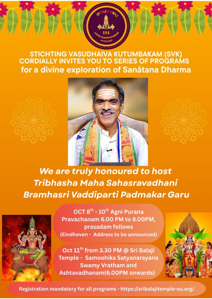 Stichting Vasudhaiva Kutumbakam (SVK) cordially invites you to a series of programs for a divine exploration of Sanātana Dharma by Sri Brahmasri Vaddiparti Padmakar garu.