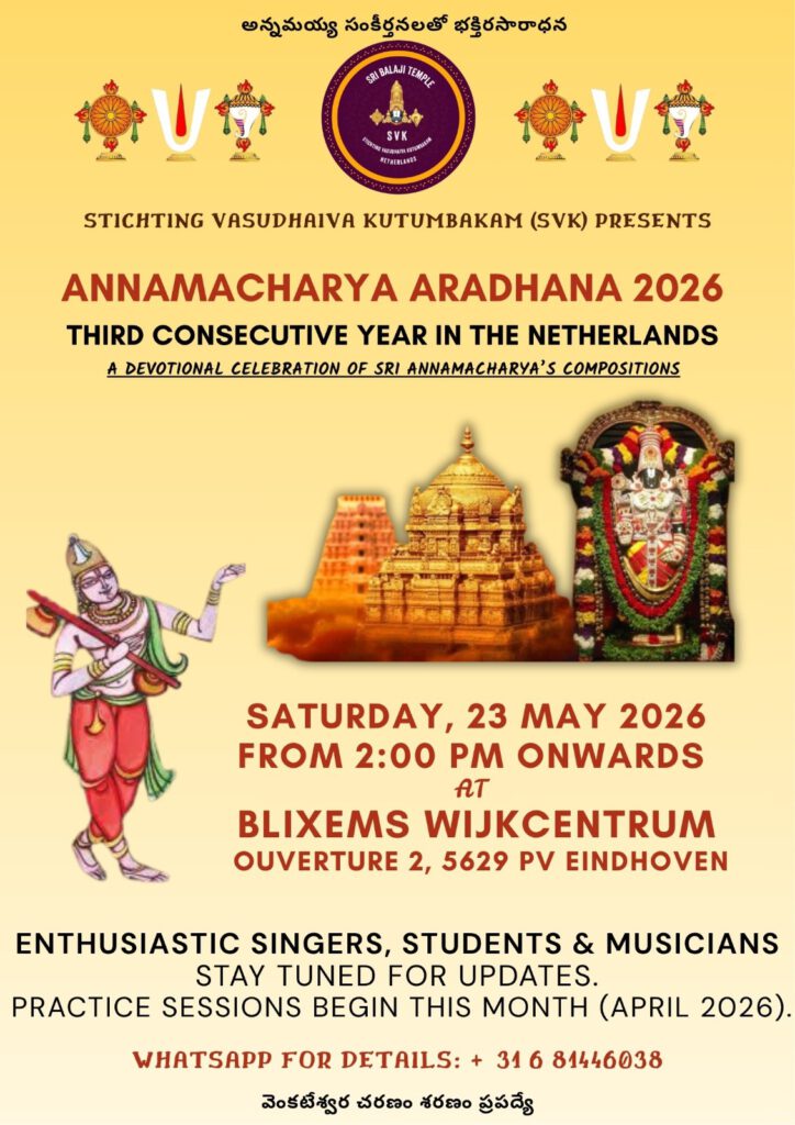 Stichting Vasudhaiva Kutumbakam(SVK) takes immense pride in commemorating and celebrating the life and legacy of Sri Annamacharya. This celebration will showcase performances by numerous esteemed music and dance schools, coming together to pay tribute through art and devotion.